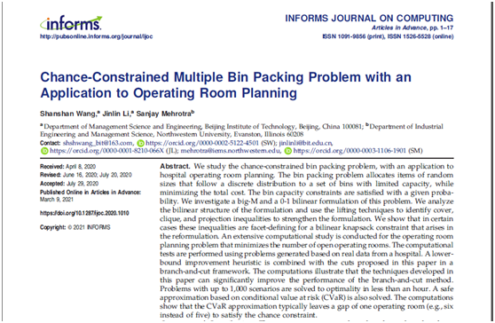 日前,北理工管理與經(jīng)濟(jì)學(xué)院李金林教授及其博士研究生王珊珊與美國西北大學(xué)工業(yè)工程與管理科學(xué)系Sanjay Mehrotra教授合作的研究成果“Chance-Constrained Multiple Bin Packing Problem with an Application to Operating Room Planning”近期在《INFORMS Journal on Computing》期刊在線發(fā)表。該項(xiàng)成果是在國家自然科學(xué)基金重點(diǎn)項(xiàng)目(71432002)支持下完成的。