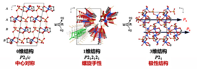 該課題組在前期通過分子指向變化調(diào)控材料力、磁物理性質(zhì)等相關(guān)工作的研究基礎(chǔ)上( Nat. Chem. , 2014, 6, 1079-1083; Nat. Commum. 2019, 10, 4805-4812; Angew. Chem., Int. Ed. 2017, 56, 717-721),結(jié)合近期通過客體分子誘導(dǎo)晶格變化的相關(guān)報道,提出通過剝離弱螯合配體驅(qū)動單晶到單晶轉(zhuǎn)變的研究思路,獲得了首例基于簡單螯合配體脫離、晶體結(jié)構(gòu)縮合誘導(dǎo)的巨大并且可逆的單晶到單晶轉(zhuǎn)變。通過乙二醇螯合配體的兩步脫離/吸附,該材料體積可逆伸縮高達(dá)50%,質(zhì)量可逆交換36%,體積與質(zhì)量變化均達(dá)到目前文獻(xiàn)報道單晶到單晶轉(zhuǎn)變的最大值。同時螯合配體脫離過程中,金屬中心相鄰配位點空間釋放,分子手性發(fā)生反轉(zhuǎn),對應(yīng)單晶材料經(jīng)歷中心對稱—螺旋手性結(jié)構(gòu)—極性結(jié)構(gòu)的兩步可逆對稱性變化。該對稱性變化通過單晶X-射線衍射、變溫二階非線性光學(xué)以及CD光譜進(jìn)行了詳細(xì)的表征。通過比照單晶結(jié)構(gòu)對稱性的轉(zhuǎn)變,作者對該結(jié)構(gòu)變化的分子運動機(jī)理進(jìn)行了深入的分析。這種具有類凝膠性質(zhì)的單晶材料為柔性分子基單晶材料的合成提供了新的思路,同時基于螯合配體脫離驅(qū)動的分子手性變化為新型手性配合物的合成提供了可能的途徑。