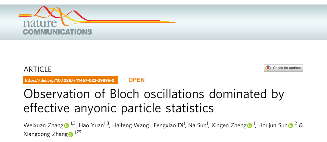 我們知道玻色子遵從玻色統(tǒng)計(jì),費(fèi)米子遵從費(fèi)米統(tǒng)計(jì)。除了玻色子和費(fèi)米子,大約四十年前,科學(xué)家提出具有介于玻色子和費(fèi)米子之間統(tǒng)計(jì)關(guān)系的準(zhǔn)粒子,被稱為任意子。具體來講,當(dāng)交換兩個(gè)任意子的空間位置時(shí),系統(tǒng)波函數(shù)會(huì)獲得一個(gè)介于0到π的相位。科學(xué)家研究發(fā)現(xiàn),雙體任意子系統(tǒng)可以展現(xiàn)與統(tǒng)計(jì)相關(guān)的布洛赫振蕩行為。雖然理論結(jié)果顯示贗費(fèi)米子振蕩周期是玻色子的兩倍,但處于中間統(tǒng)計(jì)角(0<統(tǒng)計(jì)角<π)的任意子布洛赫振蕩現(xiàn)象還沒有被揭示。更重要的是,由于問題的復(fù)雜性,有關(guān)任意子布洛赫振蕩的實(shí)驗(yàn)觀察還從來沒有實(shí)現(xiàn)。