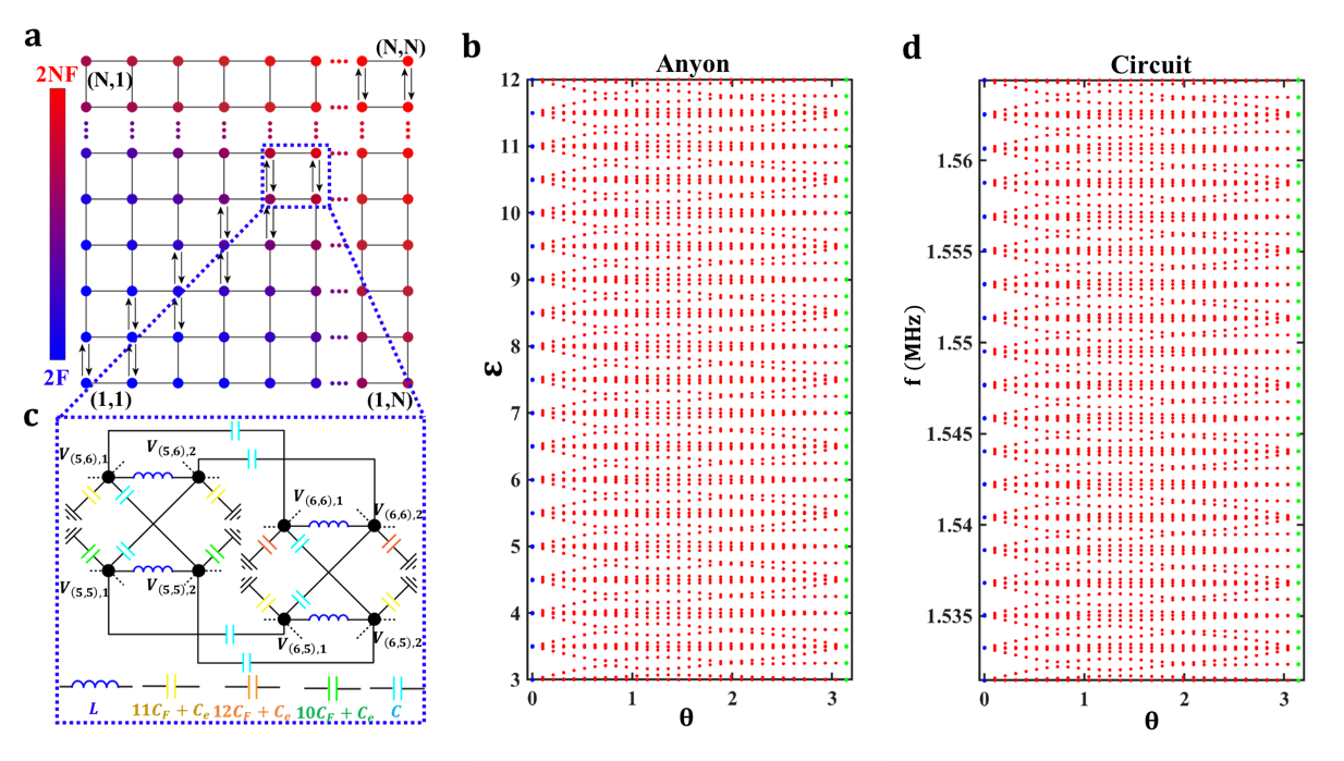 圖1. 任意子-電路網(wǎng)絡(luò)的設(shè)計(jì)方案和本征能譜。a和c:等效于一維-雙體任意子模型的二維-單體緊束縛模型及電路設(shè)計(jì)。b和d:雙體任意子和相應(yīng)電路網(wǎng)絡(luò)的本征能譜。