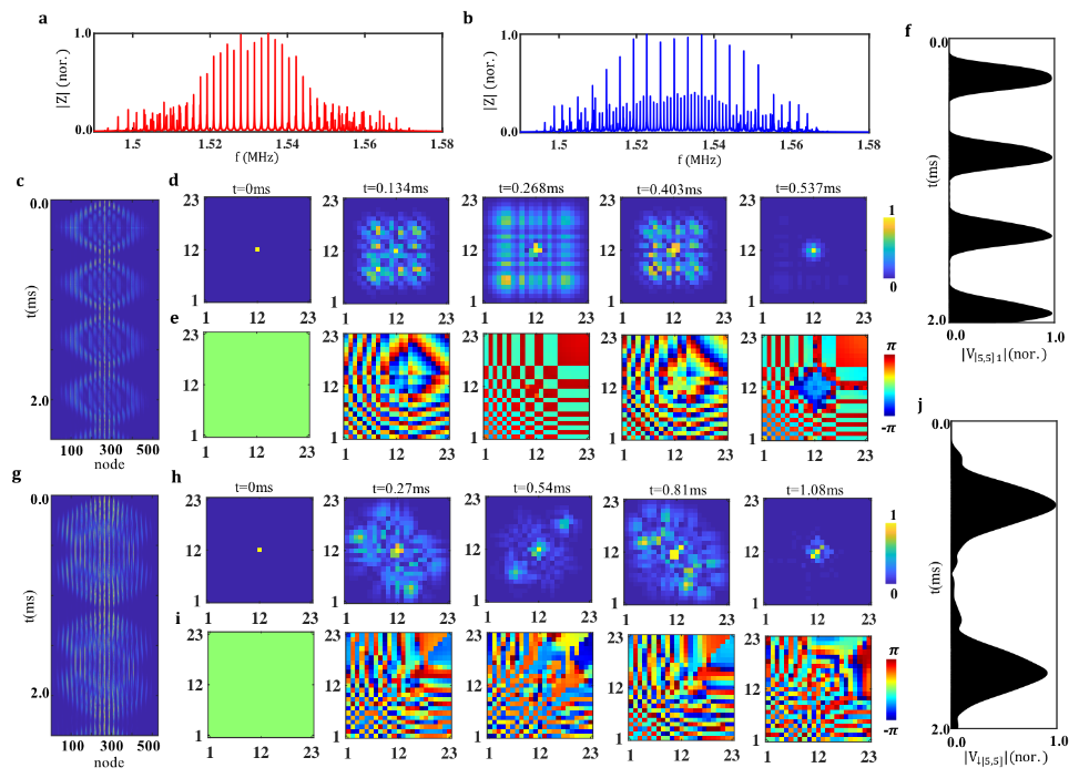 圖2和圖3中的理論仿真和實(shí)驗(yàn)測(cè)量進(jìn)一步驗(yàn)證了電路網(wǎng)絡(luò)的有效性。圖3a顯示的是電路網(wǎng)絡(luò)的樣品圖。首先,頻域的阻抗測(cè)量可以清楚的展現(xiàn)電路網(wǎng)絡(luò)的等間距能譜,并且頻率間隔滿足玻色子-電路網(wǎng)絡(luò)為贗費(fèi)米-電路網(wǎng)絡(luò)的兩倍(圖2a,2b和圖3b,3c)。時(shí)域仿真和測(cè)量的結(jié)果進(jìn)一步展現(xiàn)了由統(tǒng)計(jì)決定的布洛赫振蕩現(xiàn)象,并且與雙體-任意子的一維晶格模型一致。圖2c和2g顯示了仿真結(jié)果中所有電路格點(diǎn)的電壓信號(hào)隨時(shí)間的演化行為。可以清晰的看出,在經(jīng)典電路網(wǎng)絡(luò)中電壓信號(hào)也發(fā)生了周期性振蕩的現(xiàn)象。贗費(fèi)米-電路網(wǎng)絡(luò)的振蕩周期是玻色子-電路網(wǎng)絡(luò)的兩倍。為了更直觀的展現(xiàn)電壓信號(hào)的振蕩行為,圖2b(2e)與2h(2i)分別展現(xiàn)了激發(fā)點(diǎn)電壓的振幅(相位)在不同時(shí)刻的空間分布??梢钥吹剑I?電路網(wǎng)絡(luò)中電壓相位的對(duì)稱分布與贗費(fèi)米-電路網(wǎng)絡(luò)中電壓相位的反對(duì)稱分布與量子統(tǒng)計(jì)所決定的波函數(shù)特性一致。相應(yīng)的實(shí)驗(yàn)結(jié)果展現(xiàn)在圖3d(3e)和3g(3h)中,其與仿真結(jié)果相吻合。最后,數(shù)值計(jì)算的單格點(diǎn)電壓信號(hào)在玻色子-電路網(wǎng)絡(luò)(贗費(fèi)米-電路網(wǎng)絡(luò))的振蕩行為顯示在圖2f(2j)。相應(yīng)的實(shí)驗(yàn)結(jié)果顯示在圖3f(3i)中。進(jìn)一步可以看出,贗費(fèi)米-電路網(wǎng)絡(luò)的振蕩周期是玻色子-電路網(wǎng)絡(luò)的兩倍。實(shí)驗(yàn)中振蕩電壓信號(hào)的顯著衰減的是由電路中的損耗引起的。最后,研究者還在理論上指出,通過平衡外加勢(shì)場(chǎng)和統(tǒng)計(jì)角的競爭關(guān)系,具有介于0到π的中間統(tǒng)計(jì)角的雙體任意子系統(tǒng)可以展現(xiàn)三倍于雙波色子的振蕩行為。這一新奇的效應(yīng),也可以在電路網(wǎng)絡(luò)中得以實(shí)現(xiàn)。