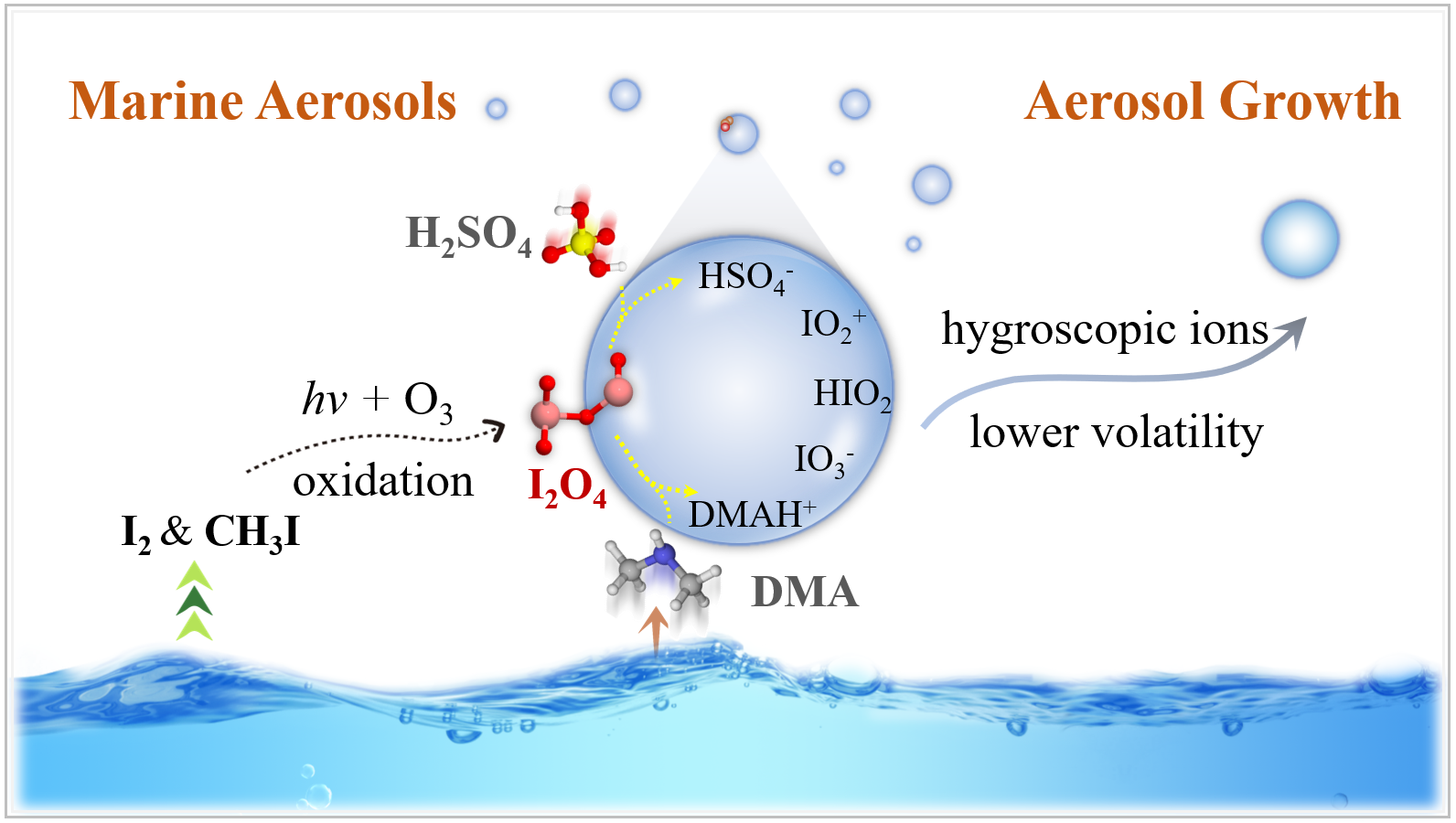 海洋氣溶膠構(gòu)成了全球最大的自然源氣溶膠體系,對全球的輻射平衡、氣候變化乃至人們的生活都有著重要影響。盡管已有研究表明含碘物質(zhì)與海洋氣溶膠的形成密切相關(guān),但其參與的氣溶膠增長機制尚不清楚。已有實驗室研究表明,碘氧化物(I x O y )是氣溶膠粒子形成的重要組分(其中四氧化二碘I2O4濃度最高)。然而,外場檢測到的氣溶膠粒子的主要碘組分為IO3-離子,卻未檢測到碘氧化物。實驗室與外場觀測上的分歧難以用當(dāng)前的化學(xué)反應(yīng)機制來解釋,這很大程度上限制了人們對碘氧化物如何影響海洋氣溶膠形成的理解。