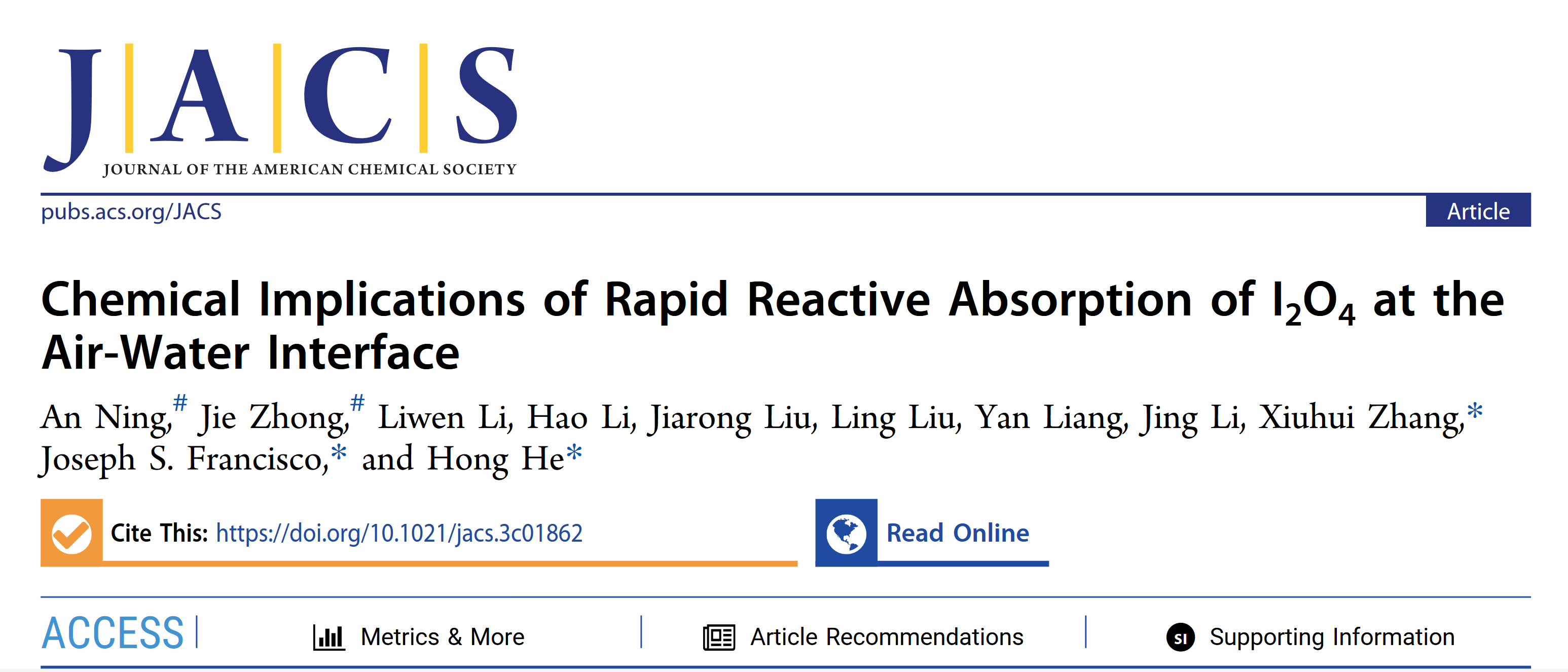 近日,北京理工大學(xué)化學(xué)與化工學(xué)院/原子分子簇科學(xué)教育部重點實驗室張秀輝教授團隊與中科院生態(tài)環(huán)境中心賀泓研究員團隊和美國賓夕法尼亞大學(xué)Joseph S. Francisco教授團隊合作,在海洋氣溶膠增長機制研究方面取得重要進(jìn)展。相關(guān)研究成果以“Chemical Implications of Rapid Reactive Absorption of I2O4 at the Air-Water Interface”為題,在國際頂級化學(xué)期刊《美國化學(xué)會志》( Journal of the American Chemical Society , JACS )上發(fā)表(DOI: 10.1021/jacs.3c01862)。該工作以北京理工大學(xué)為第一通訊單位,張秀輝教授、賀泓研究員和Joseph S. Francisco教授為共同通訊作者,北京理工大學(xué)化學(xué)與化工學(xué)院博士后寧安與中國石油大學(xué)鐘杰教授為該論文的共同第一作者。