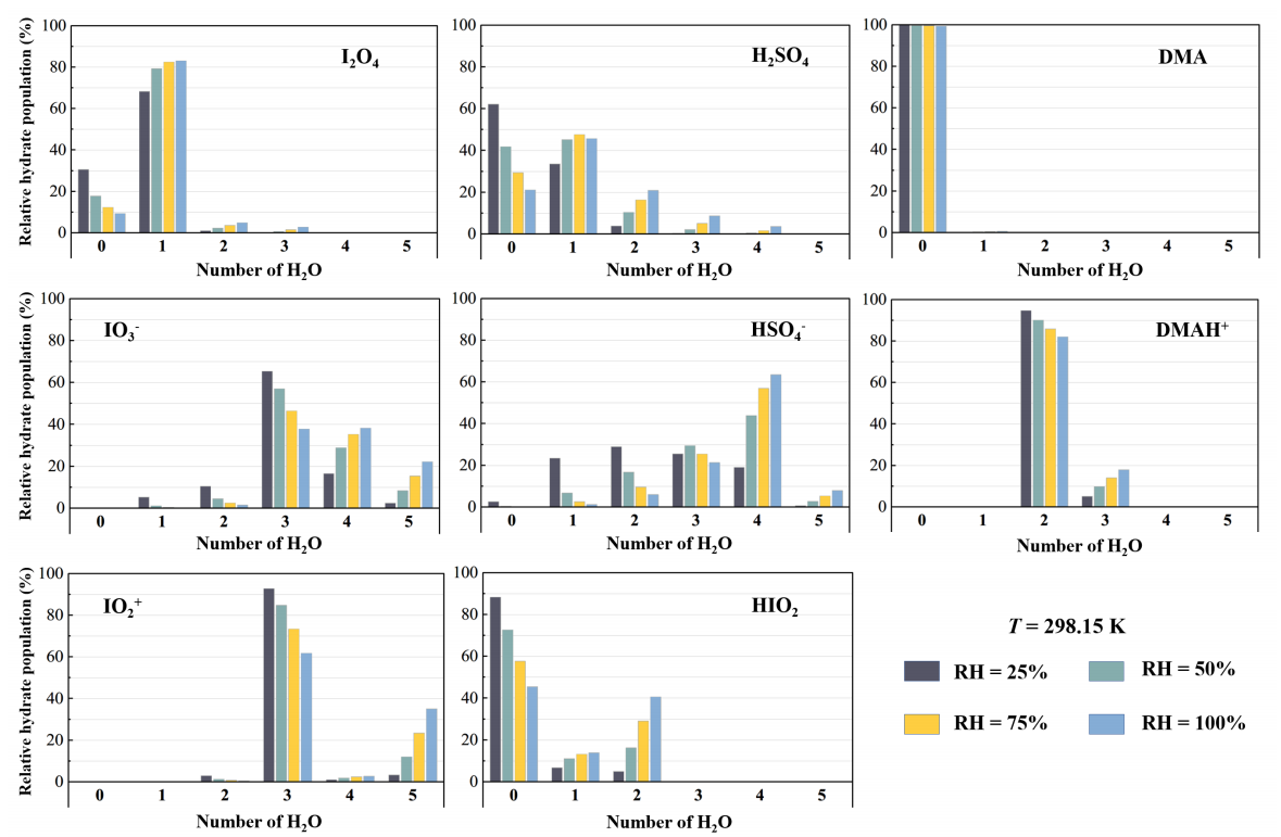 北京理工大學(xué)張秀輝教授團隊及其合作者通過量子化學(xué)計算與第一性原理分子動力學(xué)模擬相結(jié)合的方案揭示的大氣中硫酸和胺類物質(zhì)影響下的I2O4的氣-液界面(即液相氣溶膠表面)上的非均相反應(yīng)機制則較好地解釋了上述分歧問題。由于真實大氣中的化學(xué)組分遠(yuǎn)比“單純”的實驗環(huán)境更為復(fù)雜,除碘氧化物外,還存在著污染物硫酸、以及海洋類生物排放生成的胺類組分。她們合作研究發(fā)現(xiàn),在硫酸和有機胺的參與下,I2O4可在氣溶膠氣-液界面快速(皮秒級別)反應(yīng)(圖1)生成亞碘酸HIO2以及一系列離子產(chǎn)物,如HSO4-、IO3-、DMAH+等。所生成的反應(yīng)產(chǎn)物間可通過氫鍵、鹵鍵和離子鍵結(jié)合為尺寸更大的復(fù)合物,進(jìn)而限制其向液滴體相的擴散;同時,界面水分子通過氫鍵與產(chǎn)物分子結(jié)合,使其難以蒸發(fā)至氣相(圖2)。且上述附著于液滴表面的產(chǎn)物(IO3-/DMAH+等)相比于反應(yīng)物(I2O4/DMA等)有更低的揮發(fā)性和更高的吸濕性(圖3),還可促進(jìn)氣溶膠的吸濕性增長。