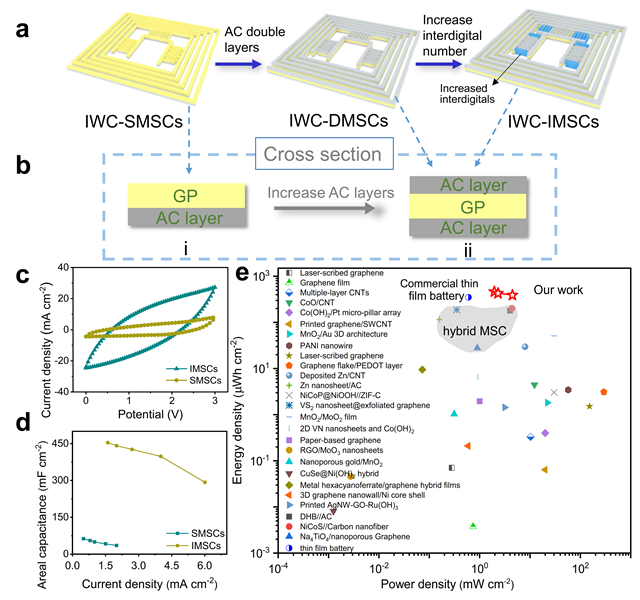 為實(shí)現(xiàn)非接觸式充電和快速大功率供能的效果,該研究者研發(fā)了一種平面同軸結(jié)構(gòu)的無(wú)縫集成的無(wú)線(xiàn)充電的微型超級(jí)電容器(IWC-MSCs)。該器件用活性炭涂覆的石墨紙經(jīng)激光刻蝕而成,由三個(gè)指狀組合型MSCs平行連接(芯片的中心,圖2a藍(lán)色部分)和具有一定圈數(shù)的無(wú)線(xiàn)充電線(xiàn)圈(芯片的外部,圖2a桔色部分)組成。共享電極(圖2a中的紫色線(xiàn))用于連接MSC和WCC。有趣的是,研究者發(fā)現(xiàn)共享電極不僅可以充當(dāng)線(xiàn)圈的導(dǎo)線(xiàn)從磁場(chǎng)中收集能量,而且還可用作三個(gè)并聯(lián)的MSC的電極(圖2a中的藍(lán)線(xiàn))。這主要是由于石墨紙(GP)具有低電阻、高電導(dǎo)率、出色的耐腐蝕性、低產(chǎn)熱量以及較高的工作電壓的優(yōu)點(diǎn),即使在密封環(huán)境中,與金屬基線(xiàn)圈(如銅線(xiàn)圈)相比,石墨線(xiàn)圈作為IWC-MSC中的一個(gè)電極在電解質(zhì)中工作時(shí)也更穩(wěn)定。因此,研究者選擇將石墨作為無(wú)線(xiàn)充電線(xiàn)圈和MSC電極一體化器件的制備原料。