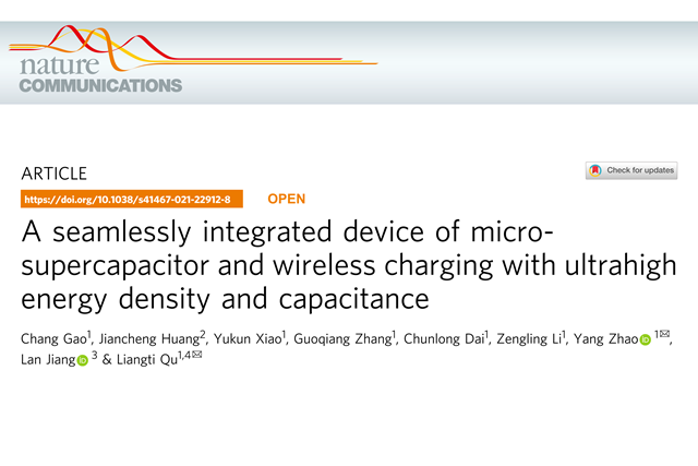 近日,北京理工大學(xué)化學(xué)與化工學(xué)院博士生高暢以第一作者身份在Nature Communications期刊發(fā)表題目為“A seamlessly integrated device of micro-supercapacitor and wireless charging with ultrahigh energy density and capacitance”的研究論文,于2021年5月11日在線(xiàn)發(fā)表,論文鏈接:https://www.nature.com/articles/s41467-021-22912-8。北京理工大學(xué)為第一通訊單位,北京理工大學(xué)化學(xué)與化工學(xué)院趙揚(yáng)特別研究員和清華大學(xué)化學(xué)系曲良體教授為共同通訊作者,北京理工大學(xué)機(jī)械與車(chē)輛學(xué)院姜瀾教授為本研究的合作者。本研究得到了國(guó)家重點(diǎn)研發(fā)計(jì)劃項(xiàng)目、國(guó)家自然科學(xué)基金和北京市自然科學(xué)基項(xiàng)目等支持。