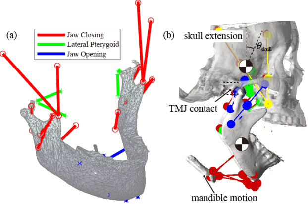 人體肌骨系統(tǒng)也是典型的多柔體系統(tǒng),其動力學(xué)與控制研究是動力學(xué)與生物力學(xué)的新興交叉融合領(lǐng)域。在肌骨系統(tǒng)動力學(xué)研究中,團(tuán)隊(duì)成員郭建嶠博士等提出了一套針對人體口頜系統(tǒng)的個性化動力學(xué)建模方法(圖3),將多體動力學(xué)應(yīng)用于口頜腫瘤手術(shù)規(guī)劃實(shí)踐。研究成果得到北大口腔醫(yī)院臨床應(yīng)用,相關(guān)論文已發(fā)表于生物力學(xué)頂級期刊《Journal of Biomechanics》(J. Guo et al. 139: 111143, 2022)。郭建嶠博士也受邀在《力學(xué)進(jìn)展》(郭建嶠等. 52(2): 1-58, 2022)上撰寫了長篇綜述論文,系統(tǒng)綜述了其在這一研究領(lǐng)域的研究成果(圖4)。2021年,郭建嶠博士還曾受邀在我國首屆“運(yùn)動生物力學(xué)與體育科技促進(jìn)研討會”作大會報(bào)告。