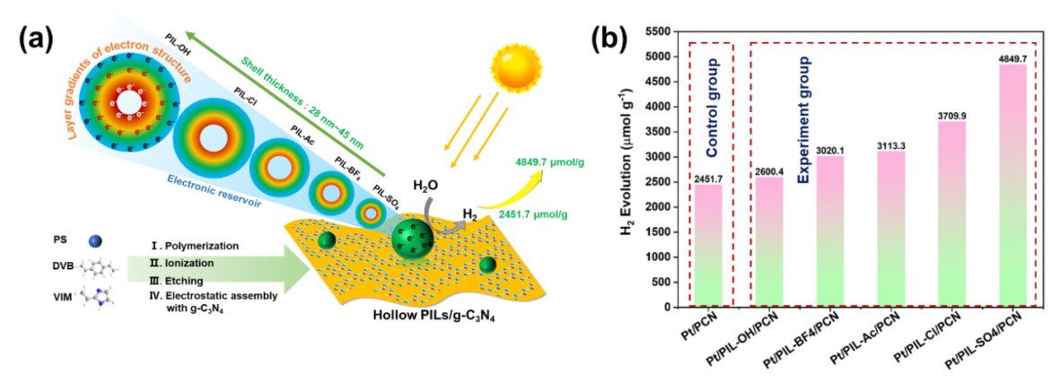 為了實現(xiàn)改性策略的突破,課題組基于離子液體微環(huán)境及其過程強化機制方面的長期積累,提出了以聚合離子液體作為“電子儲體”的概念,發(fā)展了具有層級電子分布的中空聚合離子液體微球 (PIL- x ), 并將其用于修飾的g-C3N4。利用其陰陽離子可以調(diào)控殼結(jié)構(gòu)中不同電子層厚度,影響體系的電子傳輸儲備行為,獲得了性能優(yōu)異的產(chǎn)氫催化劑(圖3)( Chem. Eng. J., 2022, 135625 )。該工作拓寬了聚合離子液體的應(yīng)用范圍,為g-C3N4及其他光催化劑的改性提供了一條新的思路,對于開發(fā)高效的光催化劑具有重要的意義。