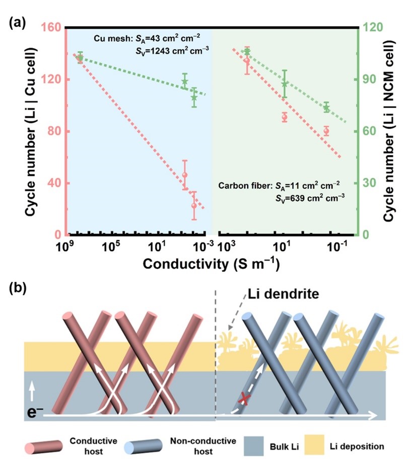 圖1. (a) 不同骨架導(dǎo)電性與電池循環(huán)性能的關(guān)系總結(jié)圖;(b) 鋰在導(dǎo)電與不導(dǎo)電骨架上沉積形貌的示意圖。