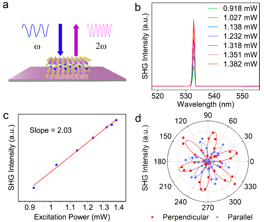 圖3. 在1064 nm激光下V3S5的SHG信號。(a) SHG測試示意圖。(b) 激光功率和SHG強度的關系;(c)二次非線性系數(shù)擬合圖;(d)SHG強度分別沿V3S5平行和垂直方向的偏振角變化關系。