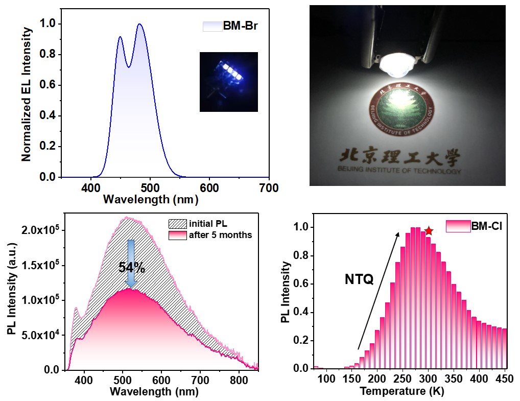最后,該團(tuán)隊(duì)將兩種二維鈣鈦礦單晶材料分別應(yīng)用于電致發(fā)光二極管(LED)和光致發(fā)光器件。基于BM-Br發(fā)光層的LED器件發(fā)出明亮的深藍(lán)光,其CIE顏色坐標(biāo)為(0.159, 0.097),很好的對應(yīng)了顯示器深藍(lán)指數(shù)的標(biāo)準(zhǔn)坐標(biāo);將BM-Cl熒光粉應(yīng)用于光致發(fā)光器件,可發(fā)出明亮的寬帶白光。此外,BM-Cl熒光粉還表現(xiàn)出一個負(fù)熱猝滅(NTQ)范圍,并且在室溫300 K左右達(dá)到最大強(qiáng)度,在450 K之前熱猝滅較弱?;贐M-Br發(fā)光層的深藍(lán)光LED和基于BM-Cl的白光熒光粉都表現(xiàn)出優(yōu)異的穩(wěn)定性(圖3),在顯示照明領(lǐng)域有較大的應(yīng)用潛力。