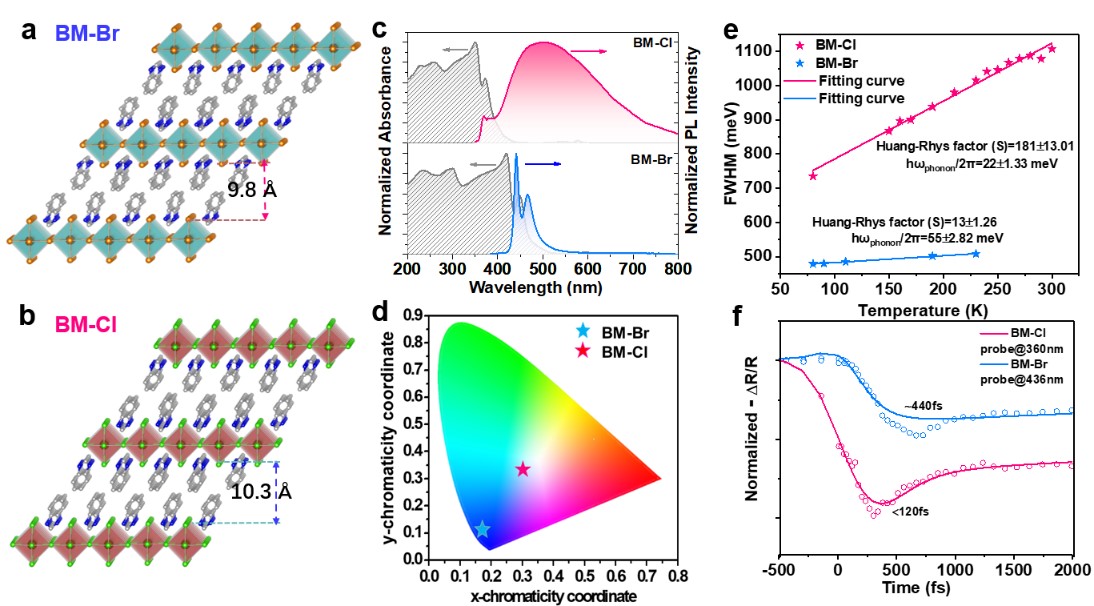 BM-Br晶體具有弱的電子-聲子耦合效應(yīng),其體現(xiàn)電子-聲子耦合強(qiáng)度的“黃-里斯(Huang?Rhys)”因子S="13,在室溫下產(chǎn)生深藍(lán)色的窄帶光致發(fā)光;而BM-Cl晶體在室溫下處呈現(xiàn)由于強(qiáng)電子-聲子耦合導(dǎo)致的STE寬帶白光發(fā)射,其S="181,這是目前所有塊體半導(dǎo)體材料中的最高值(圖 2)。因此,本工作揭示了鹵素對二維鈣鈦礦STE發(fā)射的內(nèi)在的調(diào)控機(jī)制:除了改變晶格形變勢能和自俘獲STE的勢能外,鹵素取代使BM-Cl晶體中電子-聲子耦合增強(qiáng)高達(dá)十倍,從而影響了STE的動力學(xué)。這為調(diào)控低維鈣鈦礦中的電子-聲子耦合強(qiáng)度提供了一個通用可行的新思路。