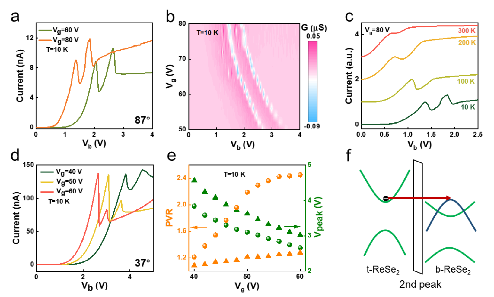 圖3展示了扭曲堆疊共振隧穿晶體管中的雙重負(fù)微分電阻峰。圖a-c展示了87° TS-RTT中雙重負(fù)微分電阻峰對柵電壓和溫度的響應(yīng)。圖d-e展示了37° 扭曲堆疊共振隧穿晶體管中雙重負(fù)微分電阻峰和雙重PVR對柵電壓的響應(yīng)。圖f展示了能帶對準(zhǔn)的示意圖,解釋了雙重負(fù)微分電阻峰的來源。
