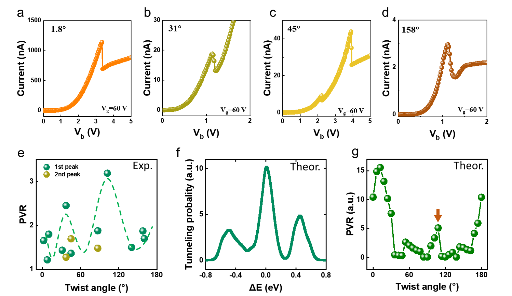 圖4展示了不同扭轉(zhuǎn)角度下的負(fù)微分電阻總結(jié)。圖a-d展示了扭轉(zhuǎn)角度為1.8°、31°、45°和158°時扭曲堆疊共振隧穿晶體管的隧穿電流與偏置電壓的關(guān)系。圖e展示了PVR隨扭轉(zhuǎn)角度變化的總結(jié),顯示在具有大扭轉(zhuǎn)角度的扭曲堆疊共振隧穿晶體管中,PVR得到了增強(qiáng)(綠色虛線為參考線)。圖f展示了計算的108°扭轉(zhuǎn)角度扭曲堆疊共振隧穿晶體管的隧穿概率隨能量偏移的變化。圖g展示了理論計算的PVR隨扭轉(zhuǎn)角度變化,與(e)中的實(shí)驗(yàn)結(jié)果一致。