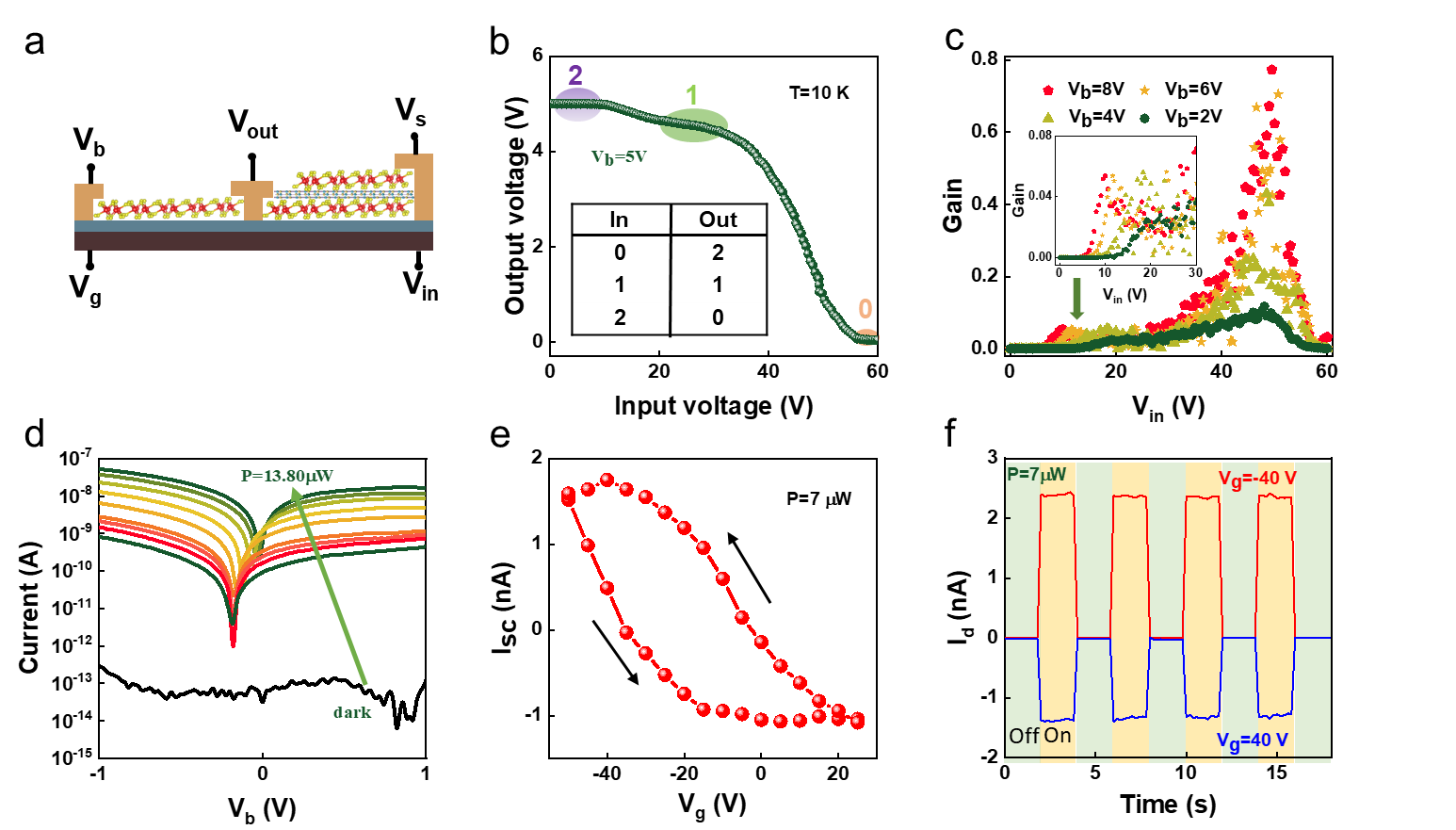 圖5展示了基于扭曲堆疊共振隧穿晶體管的三值邏輯逆變器和可調(diào)自供電光電探測器的應(yīng)用。圖a展示了由158°扭曲堆疊共振隧穿晶體管和ReSe2 場效應(yīng)晶體管組成的三值逆變器示意圖。圖b展示了逆變器輸入電壓與輸出電壓的關(guān)系,展示了三值的識別。圖c展示了逆變器增益與輸入電壓的關(guān)系。圖d展示了1.8°扭曲堆疊共振隧穿晶體管的功率依賴光電流與偏置電壓的關(guān)系。圖e展示了柵電壓依賴的光伏電流,展示了自供電光電探測器的可調(diào)性。圖f展示了在±40 V柵電壓下的光伏電流耐久性測量。