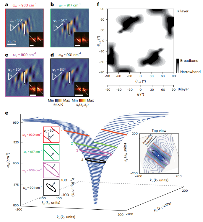 除此之外,理論研究還表明,三層轉(zhuǎn)角氧化鉬晶體中極化激元等頻線(xiàn)可以在很寬的頻率范圍(870 cm-1-940 cm-1)內(nèi)表現(xiàn)為平行直線(xiàn)(無(wú)衍射傳播)。如圖4所示,研究人員采用s-SNOM獲得了不同入射光頻率下三層轉(zhuǎn)角氧化鉬晶體的近場(chǎng)光學(xué)圖像。當(dāng)入射光頻率從901 cm-1變化至930 cm-1時(shí),近場(chǎng)光學(xué)圖像與理論預(yù)言一致:金納米天線(xiàn)激發(fā)的極化激元表現(xiàn)為沿著φc=""50°的方向高度定向傳播(無(wú)衍射損耗)。這說(shuō)明在三層轉(zhuǎn)角氧化鉬晶體中光學(xué)魔角具有光譜魯棒性,可以在寬光譜范圍內(nèi)實(shí)現(xiàn)紅外納米光場(chǎng)的高度定向傳播。
