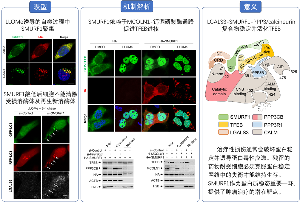 細胞通過一系列的機制將胞質(zhì)中的廢棄物質(zhì)包被進囊泡中,與溶酶體融合實現(xiàn)降解、回收、再利用維持細胞質(zhì)量控制穩(wěn)態(tài)。自噬降解是其過程中眾所周知非常重要的一環(huán),參與如生理和病理炎癥,衰老,感染,免疫及癌癥發(fā)展等過程。自噬-溶酶體穩(wěn)態(tài)再平衡受到核心轉(zhuǎn)錄因子EB(TFEB)的正向反饋機制受。mTOR磷酸化TFEB S211從而抑制其進核,同時,鈣調(diào)磷酸酶(PPP3/calcineurin)可以去磷酸化TFEB激活其進核啟動一系列與溶酶體生成、自噬相關(guān)基因轉(zhuǎn)錄。然而在溶酶體損傷情況下,致癌蛋白SMURF1在TFEB激活調(diào)控的過程中是否參與及其機制尚不明確。董磊教授團隊長期致力于自噬蛋白質(zhì)穩(wěn)態(tài)和癌癥治療,基于此前課題組的工作結(jié)果以及現(xiàn)有的報道表明,SMURF1在癌癥發(fā)展(2020,Oncogene)、聚集體與病原體的清除以及恢復(fù)內(nèi)膜損傷后的細胞穩(wěn)態(tài)等方面扮演重要角色。對此董磊課題組深入研究了SMURF1在溶酶體內(nèi)膜損傷條件下的響應(yīng),發(fā)現(xiàn)SMURF1可促進TFEB進核。進一步的實驗和分析確立了一種LGALS3-SMURF1-PPP3/calcineurin復(fù)合體模型,該復(fù)合體穩(wěn)定與活化TFEB,從而促進其核易位激活(圖2)。其意義在于,治療性損傷通常會破壞蛋白穩(wěn)定并誘導(dǎo)蛋白毒性應(yīng)激。殘留的藥物耐受細胞必須克服蛋白穩(wěn)定網(wǎng)絡(luò)中的失衡才能維持生存。認知了腫瘤治療的潛在靶點SMURF1作為蛋白質(zhì)穩(wěn)態(tài)再平衡中的重要影響。
