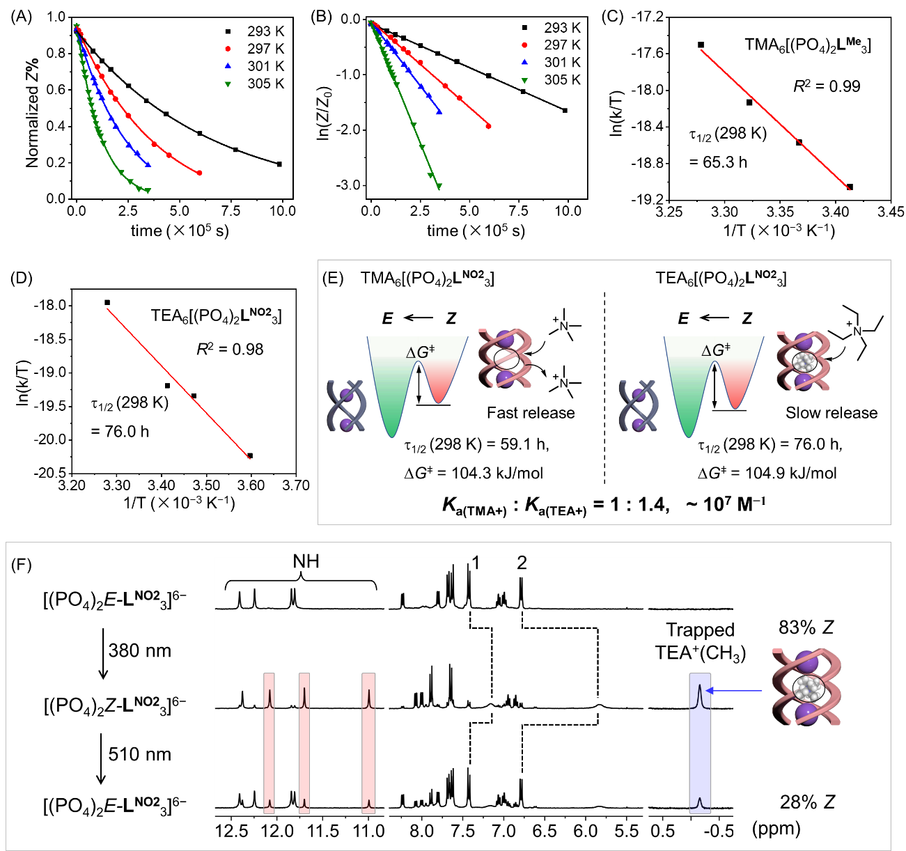 通過1H NMR系統(tǒng)研究了三螺旋結(jié)構(gòu)在不同溫度下的Z→E熱弛豫行為,利用一級反應(yīng)動力學(xué)方程進(jìn)行了數(shù)據(jù)分析,如圖2所示。結(jié)果表明:當(dāng)抗衡陽離子為四甲基銨根(TMA+)時,三股螺旋體的熱弛豫速率明顯減慢約17倍;當(dāng)抗衡陽離子為四乙基銨根(TEA+)時,三股螺旋體的熱弛豫速率明顯減慢約20倍。主要原因是三股螺旋體的順式異構(gòu)體能夠形成一個中心空腔,通過靜電作用和陽離子-π作用結(jié)合銨根離子(106 ~ 107 M?1),TEA+陽離子的結(jié)合強(qiáng)度是TMA+結(jié)合強(qiáng)度的1.4倍。