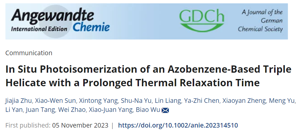 近日,北京理工大學(xué)化學(xué)與化工學(xué)院吳彪教授和趙偉特別研究員在國際知名化學(xué)期刊《 Angewandte Chemie International Edition 》上發(fā)表題目為“In Situ Photoisomerization of an Azobenzene-Based Triple Helicate with a Prolonged Thermal Relaxation Time”的研究論文。該工作實驗部分主要由北京理工大學(xué)研究生朱甲佳和孫小文完成,理論計算部分由研究生楊心彤在鄭小燕長聘副教授的指導(dǎo)下完成。此項研究得到了國家自然科學(xué)基金,北京市自然科學(xué)基金和北京理工大學(xué)青年教師學(xué)術(shù)啟動計劃等項目的資助及北京理工大學(xué)分析測試中心的支持。