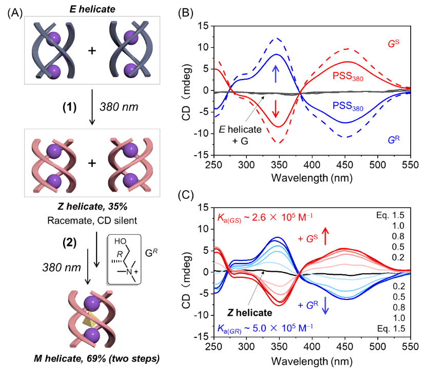 利用外部刺激調(diào)節(jié)超分子手性(如開/關(guān)、強(qiáng)度變化和手性反轉(zhuǎn))不僅有助于理解生命體中的手性行為,而且能夠為設(shè)計傳感、催化和數(shù)據(jù)處理的新型手性光學(xué)材料提供參考方法。鑒于順式三股螺旋體優(yōu)異的客體結(jié)合能力,以α-甲基膽堿衍生物作為手性客體,通過光照和手性客體引發(fā)誘導(dǎo)了同手性三股螺旋體的形成。圓二色光譜(CD)證實了光激發(fā)-手性結(jié)合的串聯(lián)作用對手性三股螺旋體的調(diào)控,如圖3所示。