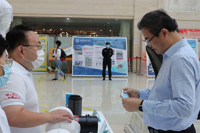 校黨委書記趙長祿現(xiàn)場觀看學(xué)生雙創(chuàng)作品,并與雙創(chuàng)團隊師生親切交流。