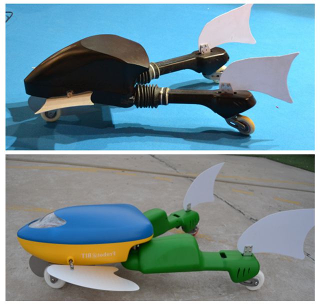 圖3中展示了兩個機器人:黑色的是第一代兩棲蛙板機器人;花色的是第二代兩棲蛙板機器人。二代機器人是在一代機器人的基礎上發(fā)展而來,它在穩(wěn)定性以及運動速度方面有了很大的提高。