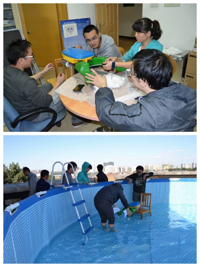 接近一年的奮斗歷程,團隊成員克服了種種困難成功地進行了兩代兩棲機器人的制作以及調試。期間團隊成員也遇到了很多困難:機械干涉問題、外殼難以安裝、電機老化極其損壞、燒壞電路板、程序調試難題、信號干擾……在困難面前,團隊成員用最理智的方法解決難題,保證每次的損失達到最小。機械零件的繪制、外殼模型的建立與繪制、機器人的整體安裝、加工廠的尋找、合同的簽訂、方案的制定……每一個過程團隊成員都得親自完成。