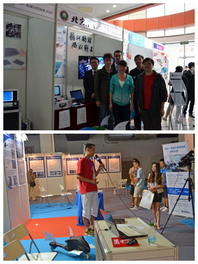 圖6 第13屆挑戰(zhàn)杯現(xiàn)場(上),團隊成員接受電視臺采訪(下)