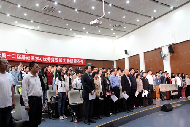 為進(jìn)一步加強(qiáng)低年級(jí)學(xué)生學(xué)風(fēng)建設(shè),營(yíng)造積極上進(jìn)的學(xué)習(xí)氛圍,2014年4月21日下午,北京理工大學(xué)第十二屆基礎(chǔ)課學(xué)習(xí)優(yōu)秀獎(jiǎng)表彰大會(huì)在良鄉(xiāng)校區(qū)綜合樓報(bào)告廳隆重舉行。校黨委副書(shū)記、副校長(zhǎng)李和章,教務(wù)處副處長(zhǎng)楊剛,學(xué)生工作處副處長(zhǎng)徐建,校團(tuán)委副書(shū)記陸寶萍、基礎(chǔ)教育學(xué)院和部分專(zhuān)業(yè)學(xué)院領(lǐng)導(dǎo)、老師,以及2012級(jí)、2013級(jí)各班級(jí)主要學(xué)生干部參加了本次大會(huì)。大會(huì)由基礎(chǔ)教育學(xué)院黨委副書(shū)記、副院長(zhǎng)肖坤主持。