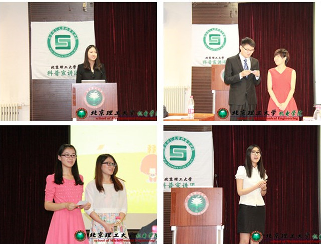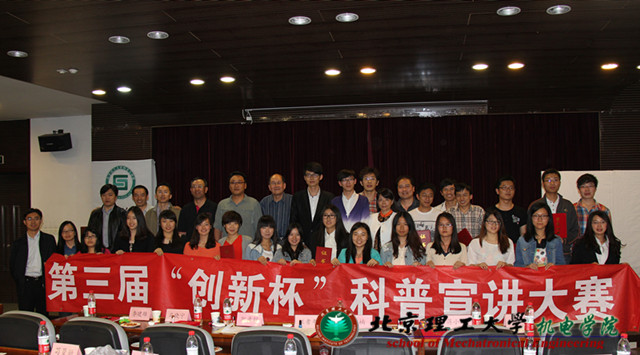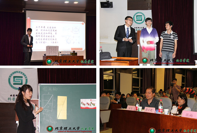 2014年4月26日晚,北京理工大學(xué)第三屆“創(chuàng)新杯”科普宣講大賽總決賽在研究生樓101報(bào)告廳隆重舉行。出席本次比賽的嘉賓有教育部中央教育科學(xué)研究所科技教育中心研究員汪耆年老師,團(tuán)市委事業(yè)部部長(zhǎng)張楠老師,北京市青少年學(xué)生活動(dòng)中心活動(dòng)策劃部副部長(zhǎng)蔣小建老師,北京市教委學(xué)生活動(dòng)管理中心活動(dòng)策劃張錚老師,宣武區(qū)科技館特聘老師李建雄老師,北京市海淀區(qū)寄讀學(xué)校科技教師王飛老師,校黨委副書記、副校長(zhǎng)李和章教授,學(xué)生工作處處長(zhǎng)郭彥懿老師,校團(tuán)委書記藺偉老師,研工部副部長(zhǎng)馬曉寧老師,校團(tuán)委副書記茍曼麗老師,機(jī)電學(xué)院黨委副書記、副院長(zhǎng)楊瑞偉,機(jī)械與車輛學(xué)院黨委副書記、副院長(zhǎng)范文輝老師,以及來(lái)自北京理工大學(xué)各個(gè)學(xué)院的參賽選手和觀眾近200人參加。