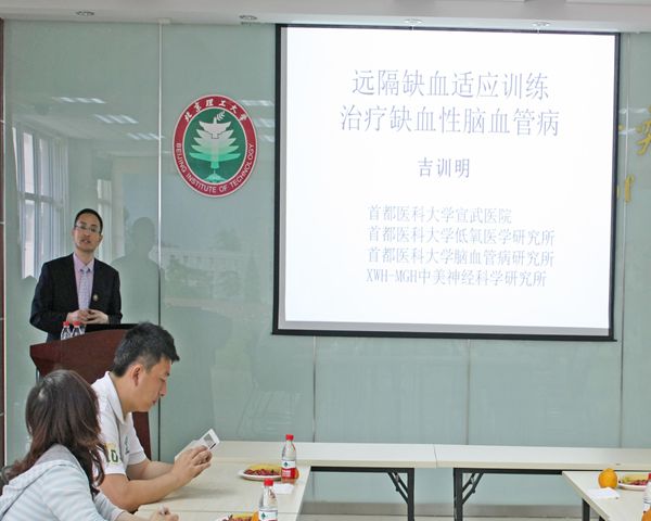 儀式結(jié)束后,吉訓(xùn)明教授向生命學(xué)院研究生介紹了宣武醫(yī)院的概況和國(guó)家卒中搶救與治療指導(dǎo)中心的服務(wù)平臺(tái),并作了一場(chǎng)題為“遠(yuǎn)隔缺血適應(yīng)訓(xùn)練治療缺血性腦血管病”的學(xué)術(shù)報(bào)告。報(bào)告對(duì)缺血適應(yīng)的由來(lái)以及缺血適應(yīng)訓(xùn)練治療對(duì)缺血性腦血管病的作用進(jìn)行了講解,對(duì)老年多發(fā)的卒中疾病進(jìn)行了科普講解,參加報(bào)告的老師同學(xué)對(duì)遠(yuǎn)隔缺血預(yù)適應(yīng)的影響等方面進(jìn)行了積極的討論。