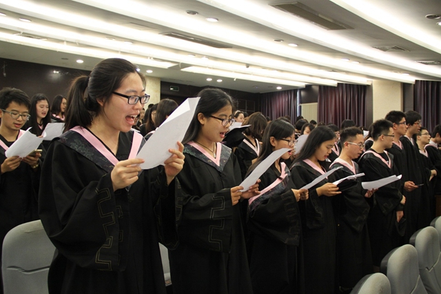 學(xué)院教師汪雅麗老師作為教師代表發(fā)言。她希望同學(xué)們在今后的人生道路上,保持開放的心態(tài),不斷追求改變,讀萬卷書,行萬里路,以謙遜的態(tài)度,勇敢的心智把未來的路越走越寬廣。外國語學(xué)院02級英語專業(yè)本科生、06級英語專業(yè)碩士生、現(xiàn)就職于中國商務(wù)部人事司的毛碩作為杰出校友代表發(fā)言。作為一個過來人,結(jié)合自己的人生感悟,他用了三個關(guān)鍵詞:“享受”、“包容”和“擔(dān)當(dāng)”來寄語學(xué)弟學(xué)妹們,并希望學(xué)弟學(xué)妹們要保持對專業(yè)和事業(yè)的尊重與敬畏,在社會大舞臺上闖出屬于自己的一片天。