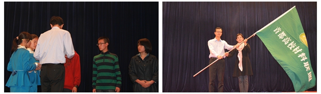 閉幕式上還為在本次文化節(jié)中有突出表現(xiàn)的各高校材子材女們頒發(fā)獲獎(jiǎng)證書(shū),以表彰他們?cè)谖幕?jié)各項(xiàng)活動(dòng)中表現(xiàn)出來(lái)的不屈不撓、努力奮斗的精神。作為下屆材料文化節(jié)的承辦方,我院黨委副書(shū)記、副院長(zhǎng)張艦月從北京航空航天大學(xué)材料學(xué)院黨委副書(shū)記張江手中鄭重接下首都高校聯(lián)盟旗幟。