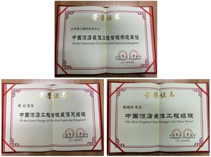 2013年和2014年,理工國際會議中心連續(xù)兩次獲得中國酒店工程聯(lián)盟、中國酒店“金工獎”評審委員會評選的“中國酒店最佳工程管理示范單位”和“中國酒店最佳工程管理示范單位”榮譽稱號。姚繼民同志連續(xù)兩年被評為“中國酒店最佳工程經(jīng)理”,鄭紅同志連續(xù)兩年被評為“中國酒店工程管理最佳總經(jīng)理”。