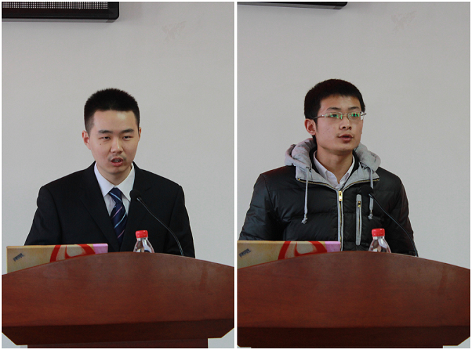 隨后,來自2011級實驗班的彭開南同學(xué)代表“優(yōu)異生獎學(xué)金”獲得者發(fā)言。彭開南同學(xué)首先代表所有獲獎學(xué)生向?qū)W院和老師表示感謝,并表示設(shè)立學(xué)院獎學(xué)金是對同學(xué)們學(xué)習(xí)工作的肯定和鼓勵。彭開南同學(xué)在發(fā)言中說道,“這是我們最好的時代”,號召大家要開啟自己的未來,早計劃,早安排,不要輕視自己的能力、浪費自己的天賦,為自己、為北理、為我們可愛的祖國努力。接著,2012級信息科技菁英班班長胡文慶同學(xué)作為“學(xué)習(xí)成績優(yōu)秀班集體”獲獎代表,向大家報告了班級中各班委各司其職,同學(xué)團結(jié)向上,最終取得優(yōu)異成績的情況,與廣大同學(xué)交流了建設(shè)優(yōu)秀班集體的經(jīng)驗和體會。