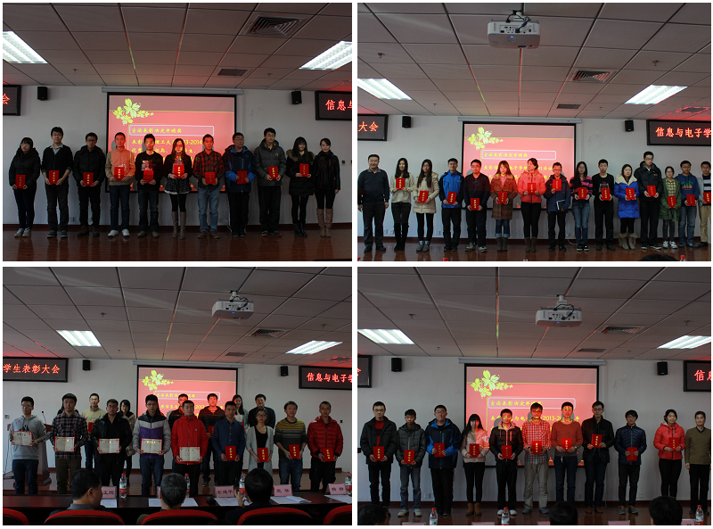 大會首先由楊靜副院長宣讀《關(guān)于表彰2013-2014學(xué)年優(yōu)秀學(xué)生標(biāo)兵、優(yōu)秀學(xué)生、優(yōu)秀學(xué)生干部、先進(jìn)班集體、優(yōu)良學(xué)風(fēng)班和優(yōu)良學(xué)風(fēng)宿舍的決定》并向獲獎代表頒獎;副院長薛正輝宣讀《關(guān)于表彰信息與電子學(xué)院“我們?yōu)樯鐣髁x核心價值觀代言”主題團日活動優(yōu)秀獎、海報設(shè)計大賽優(yōu)勝獎的決定》、《關(guān)于表彰信息與電子學(xué)院2013-2014學(xué)年優(yōu)異生獎學(xué)金的決定》并頒獎;黨委副書記副院長黨華宣讀《關(guān)于表彰信息與電子學(xué)院2013-2014學(xué)年社會工作優(yōu)秀獎、優(yōu)秀社團獎的決定》并頒獎;副院長徐曉文宣讀《關(guān)于表彰信息與電子學(xué)院2013-2014學(xué)年六級高通過班級獎、四級全通過班級獎的決定》并頒獎;最后學(xué)院黨委書記安建平宣讀《關(guān)于表彰信息與電子學(xué)院2013-2014學(xué)年學(xué)習(xí)成績優(yōu)秀獎、學(xué)習(xí)成績優(yōu)秀班集體的決定》并頒獎。