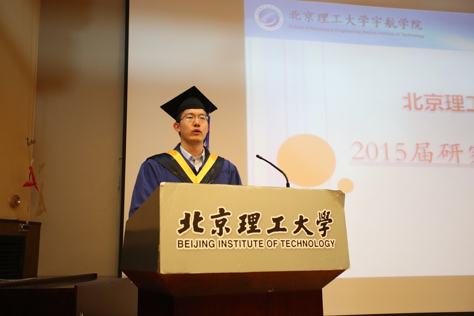 2012級(jí)碩士生陳喆代表全體畢業(yè)生發(fā)言,他深情地回顧了在北京理工大學(xué)學(xué)習(xí)和生活的點(diǎn)滴,致敬在理工的每一滴汗水,回味聚在一起的每一個(gè)瞬間,懷念朝夕相處的那一段光陰流年,表達(dá)了對(duì)母校、對(duì)老師、對(duì)同學(xué)的感恩和不舍。