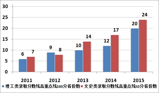 全國(guó)文史類錄取分?jǐn)?shù)線與排名刷新紀(jì)錄。在全國(guó)31個(gè)省份中,我校文史類分差高于去年的省份達(dá)27個(gè),其中有26個(gè)省份刷新近5年最好成績(jī);分差超過(guò)50分以上的有24個(gè),較2014年增加7個(gè)。在公布排名的25個(gè)省份中,21個(gè)省份錄取分?jǐn)?shù)線排名較去年進(jìn)一步提升,1個(gè)省份持平,17個(gè)省份錄取分?jǐn)?shù)線排名進(jìn)入全省前1000名,較2014年增加6個(gè)。