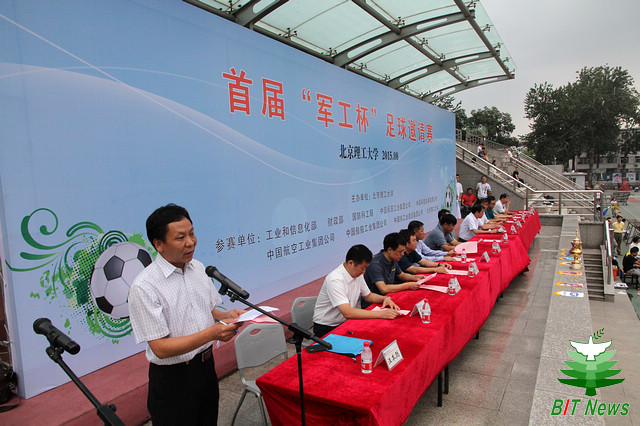 開幕式上,樓宇光為比賽致開幕詞,他代表工信部直屬機關(guān)黨委對本次比賽的舉辦表示祝賀。感謝北理工在為國家工業(yè)化、信息化、兩化深度融合,以及國防現(xiàn)代化做出卓越貢獻的同時,還能夠積極發(fā)揮學(xué)校在足球運動方面的優(yōu)勢與特色,籌辦本次“軍工杯”足球賽,為軍工系統(tǒng)各單位通過足球運動加強交流,強健體魄,建設(shè)優(yōu)秀組織文化搭建了良好平臺,符合當(dāng)下國家振興足球、提高人民群眾身體素質(zhì)的指導(dǎo)思想。2015年是紀念抗戰(zhàn)勝利70周年,誕生在抗戰(zhàn)烽火中的北理工也將迎來75周年華誕,因此我們?nèi)w參賽的軍工人也是通過比賽的形式弘揚軍工文化,矢志建設(shè)國防的奉獻精神,共同慶祝北理工建校75周年。希望北理工全體教職員工凝心聚力,深化改革,為早日建成世界一流理工大學(xué)不斷努力奮斗。