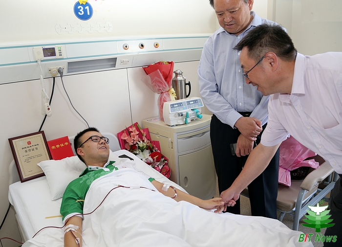 9月7日,是北京理工大學(xué)研究生入學(xué)報(bào)到的日子。當(dāng)日,也是我校機(jī)電學(xué)院2015級博士研究生孫一銘在海軍總醫(yī)院成功分離造血干細(xì)胞的日子,造血干細(xì)胞被送往上海,將救助一名患有白血病的八歲兒童。孫一銘本科、碩士均就讀于北京理工大學(xué),是學(xué)校歷史上第四位捐獻(xiàn)造血干細(xì)胞的同學(xué)。副校長方岱寧、機(jī)電學(xué)院黨委書記栗蘋、副書記副院長楊瑞偉,學(xué)校辦公室、黨委宣傳部、研究生工作部負(fù)責(zé)人及相關(guān)工作人員前往醫(yī)院探望,北京市紅十字會副會長劉娜及中華骨髓庫北京分庫的工作人員和志愿者們也前往探望,并對孫一銘及其家人表示親切的慰問和感謝。