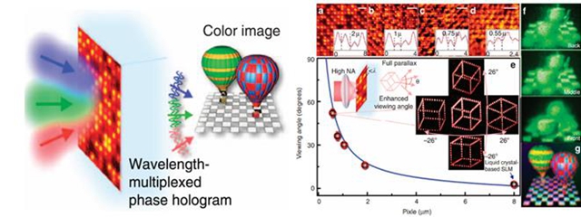 今年年初,項(xiàng)目組劉娟教授等人與澳大利亞斯威本科技大學(xué)的Min Gu院士研究組合作,首次實(shí)現(xiàn)了亞波長像素尺寸的可擦寫全息顯示器件,可用于大視場角彩色全息三維顯示。通過超小聚焦的飛秒激光光束將氧化石墨烯還原,改變其折射率,再現(xiàn)的全息三維圖像的視場角比以往技術(shù)增大一個(gè)數(shù)量級,并提出了動態(tài)彩色全息三維顯示的可行性方案。該項(xiàng)研究成果于今年4月發(fā)表于Nature子刊《自然通訊》(Nature Communications,6, 6984, 2015)。