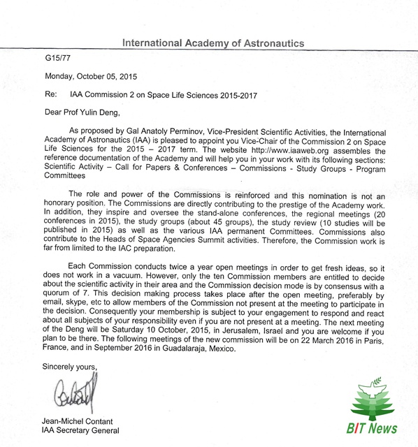 鄧玉林教授長期立足于空間生命科學研究,于2013年9月當選為國際宇航科學院通訊院士。國際宇航科學院依據院士增選規(guī)則,在2015年6月決定增選鄧玉林教授為國際宇航科學院院士。2015年10月初國際宇航科學院又任命鄧玉林教授為其學術委員會副主席,在任免通知中希望鄧玉林教授作為首位中國籍副主席,能夠積極參與到國際宇航科學院在全球范圍內的20個學術會議、45個研究小組和10個出版物的組織和領導工作之中,為世界航天科技的發(fā)展做出貢獻。