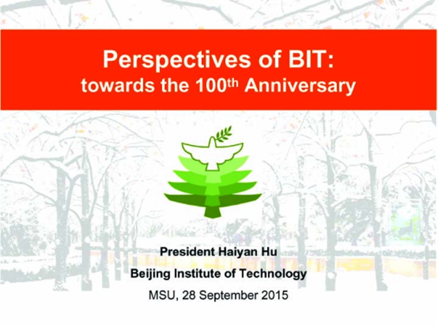 胡校長隨后做了題為“北理工建校百年愿景(Perspectives of BIT: towards the 100th Anniversary)”的演講,從歷史回顧之一(1940~1980)、歷史回顧之二(1980~2000)、新世紀辦學思路(2001~2040)三個歷史階段展現(xiàn)我校發(fā)展軌跡和未來愿景,系統(tǒng)闡述了建設亞洲/世界一流理工大學的目標、瞄準國家戰(zhàn)略需求的發(fā)展定位、學術為基和育人為本的價值取向、開放辦學的國際化戰(zhàn)略。
