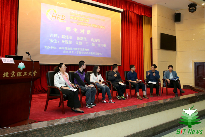 尤為突出的是圍繞“學(xué)生中心”特色,CHED2015年會特設(shè)了“師生對話”活動環(huán)節(jié),邀請了四位北京理工大學(xué)本科生——信息學(xué)院賀思衡、材料學(xué)院朱熠、外國語學(xué)院丘逸倫、王一如同與會專家趙炬明、桑新民、龐海芍三位教授進(jìn)行現(xiàn)場對話,引發(fā)與會代表強(qiáng)烈共鳴,會場爆發(fā)出陣陣掌聲和笑聲。