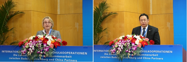 Theresia Bauer部長(zhǎng)在致辭中闡述了中德高等教育領(lǐng)域合作的重要意義,高度評(píng)價(jià)巴符州高校與中國(guó)伙伴學(xué)校的合作。她相信,高等教育國(guó)際化是時(shí)代的要求,學(xué)生交換、教師交流和科技合作不僅推動(dòng)了高校的國(guó)際化,也對(duì)區(qū)域發(fā)展和全球經(jīng)濟(jì)做出了積極的貢獻(xiàn)。Bauer部長(zhǎng)表示,巴登符騰堡州科學(xué)、研究及藝術(shù)部將采取積極措施,支持大學(xué)校長(zhǎng)之間、學(xué)者之間分享多樣化的合作經(jīng)驗(yàn)、謀劃共同的國(guó)際化發(fā)展道路,為巴符州高校與中國(guó)伙伴學(xué)校建立內(nèi)容更加豐富的合作提供服務(wù)。楊曉春處長(zhǎng)概述了中德教育交流合作所取得的豐富成果,高度評(píng)價(jià)本次論壇在豐富中德高校合作方面的重要意義,期望雙方高校為加強(qiáng)兩國(guó)高層人才培養(yǎng)、創(chuàng)新發(fā)展、產(chǎn)業(yè)轉(zhuǎn)型以及廣泛的人文交流的合作積極作為,為服務(wù)兩國(guó)關(guān)系發(fā)展、匯聚兩國(guó)民眾智慧做出新的貢獻(xiàn)。