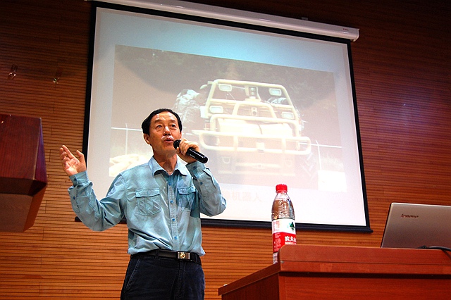 基礎(chǔ)教育學(xué)院機(jī)械與運(yùn)載學(xué)部“名家論軍工”系列講座第20期近日在良鄉(xiāng)音樂廳舉行。機(jī)械學(xué)部科協(xié)邀請(qǐng)到我校校友、武警裝備研究所總工程師陳曉東為大一大二學(xué)生帶了一場(chǎng)題為“反恐機(jī)器人與機(jī)器人戰(zhàn)爭(zhēng)”的精彩講座。智能機(jī)器人研究所孔祥戰(zhàn)、機(jī)械與運(yùn)載學(xué)部副主任張磊、學(xué)部輔導(dǎo)員及240余名學(xué)生參加此次講座。