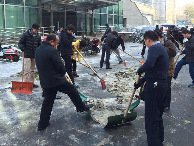 11月22日星期天,是我國傳統(tǒng)節(jié)氣“小雪”, “小雪”的到來,意味著冬季降雪即將拉開大幕。這一天,紛紛揚(yáng)揚(yáng)的一場大雪喜降大地,北理工校園銀裝素裹,一片潔白。農(nóng)諺說“小雪雪滿天,來年必豐年。”這預(yù)示著明年又是一個(gè)豐收年。后勤集團(tuán)領(lǐng)導(dǎo)在感受豐收喜悅和校園美景的同時(shí),不免為廣大師生員工的出行安全隱隱擔(dān)憂。22日下午,集團(tuán)總經(jīng)理李晉平、副總經(jīng)理陳洋不約而同來到校園安排掃雪鏟冰工作。