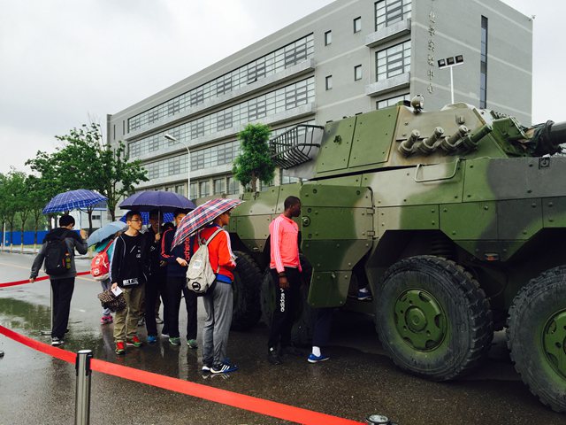 。。來自特種車輛研究所的吳維副教授及研究生代表準(zhǔn)備了專題講解紀(jì)錄片,現(xiàn)場為同學(xué)們講解裝甲車的構(gòu)造及制動原理,“11式8X8輪式裝甲突擊車是一種具有多種打擊能力、強(qiáng)大火力和高機(jī)動性的裝甲突擊武器。該車采用帶有獨(dú)立懸掛的88輪式裝甲車底盤,H型傳動,自動變速箱,機(jī)動性和越野能力突出。”雖然氣溫驟降,小雨不斷,但同學(xué)們的好奇和熱情高漲,在學(xué)習(xí)國防科技知識的同時,同學(xué)們被我校一代代從事國防科技研究前輩們的精神感染,加深了對加強(qiáng)國防建設(shè)重要性的理解,受到了愛國主義教育的熏陶,紛紛表示要努力學(xué)習(xí)科學(xué)文化知識,矢志軍工報國,為國防現(xiàn)代化建設(shè)做出新的更大的貢獻(xiàn)?;顒映掷m(xù)了5個多小時,近300余名師生進(jìn)入裝甲車進(jìn)行了參觀。