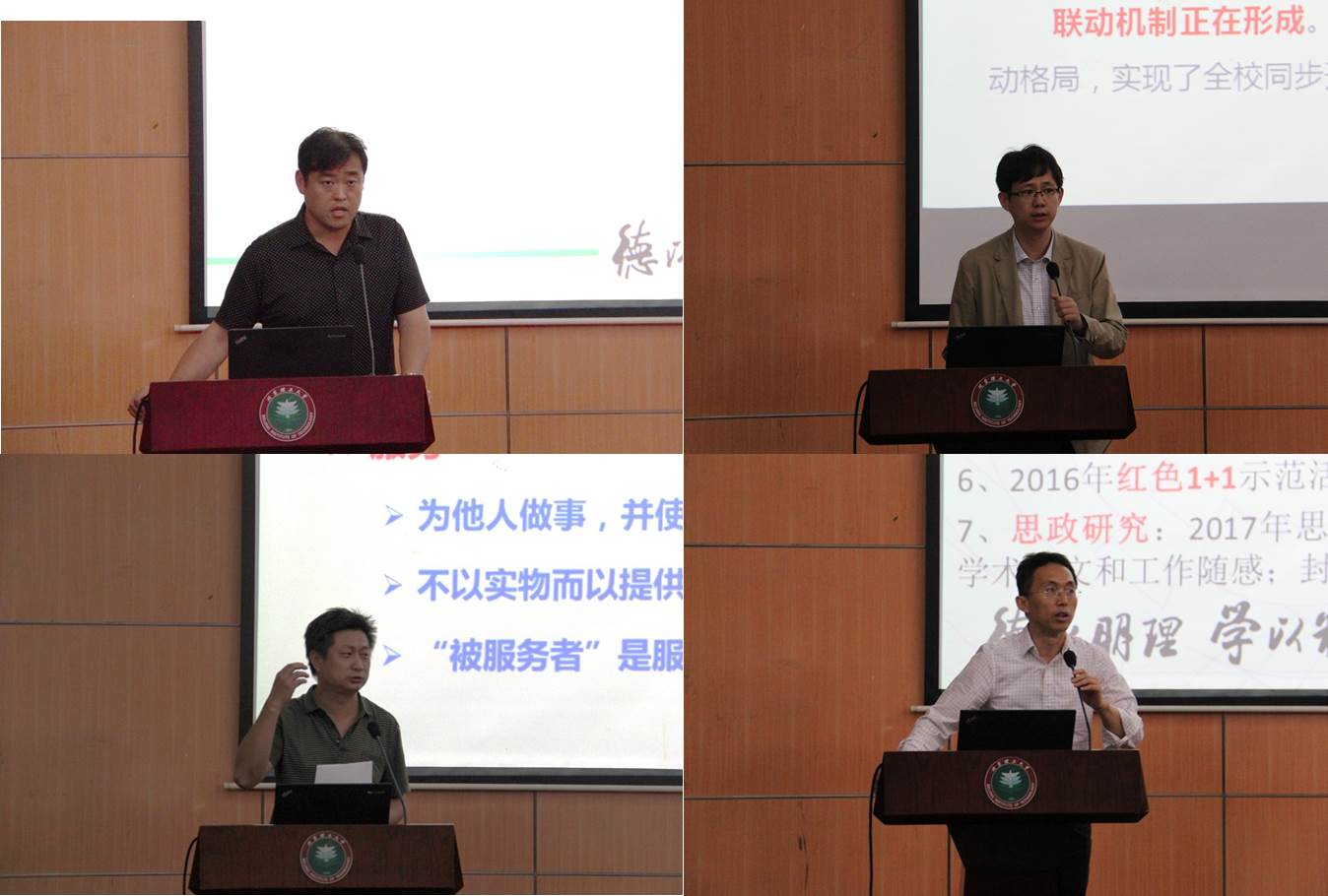 郭彥懿介紹了學(xué)工部、研工部機(jī)構(gòu)調(diào)整后的科室劃分及崗位職責(zé),對加強(qiáng)和改進(jìn)學(xué)生思想引導(dǎo)、“兩學(xué)一做”、兩校區(qū)運(yùn)行、心理健康教育、畢業(yè)季活動(dòng)、校園安全穩(wěn)定等重點(diǎn)工作進(jìn)行了詳細(xì)安排。以問題為導(dǎo)向,強(qiáng)調(diào)學(xué)生工作干部要及時(shí)關(guān)注學(xué)工辦公平臺通知并安排好工作,嚴(yán)格執(zhí)行會(huì)議和值班的請銷假制度,考試周到來之前,要加強(qiáng)考風(fēng)考紀(jì)教育。強(qiáng)調(diào)要加強(qiáng)學(xué)生思想引導(dǎo)工作,堅(jiān)持以正面教育為主、管好陣地平臺、關(guān)注學(xué)生思想動(dòng)態(tài)、加強(qiáng)分析研判、細(xì)化應(yīng)對預(yù)案,及時(shí)引導(dǎo)響應(yīng)。明確了學(xué)生工作干部“加強(qiáng)思政教育、維護(hù)安全穩(wěn)定、開展黨建團(tuán)建、服務(wù)學(xué)生發(fā)展”等四項(xiàng)主體責(zé)任。
