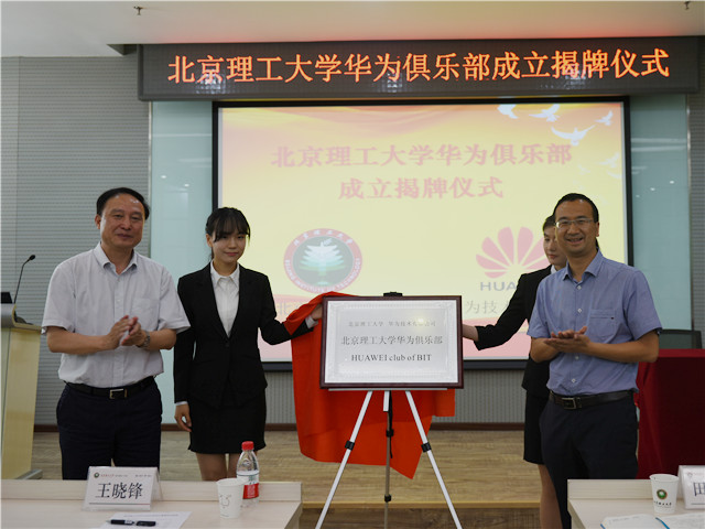 2016年5月24日上午,北京理工大學(xué)華為俱樂部(以下簡(jiǎn)稱華為俱樂部)成立揭牌儀式在體育館南廳唯實(shí)報(bào)告廳舉行。華為技術(shù)有限公司北京研究所所長(zhǎng)田興普、副所長(zhǎng)張麗娟、人力資源部經(jīng)理俞婷君,北京理工大學(xué)副校長(zhǎng)王曉鋒、招生就業(yè)工作處處長(zhǎng)李振鍵、副處長(zhǎng)林驥佳等出席了揭牌儀式。